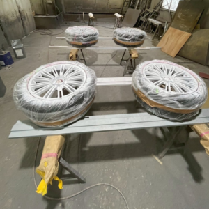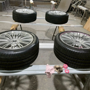 今回の施工事例は、自動車のタイヤホイール(アルミ製)に対する再塗装工事です。