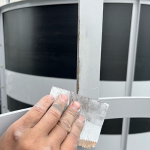 塗装工程では、まずキズ周辺の汚れを取り除き、下地を整えます。下塗りには、防錆性能に定評のある「エポティー」を使用しました。エポキシ樹脂系の塗料で、スチール素地への密着性が非常に高く、キズから発生しがちな錆を根元からブロックします。