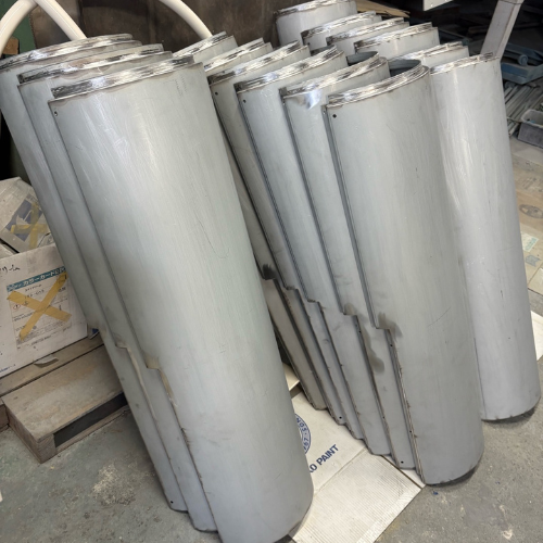 今回の施工事例は、建築物のR形状の柱カバーパネルに対する粉体プライマー塗装工事です。