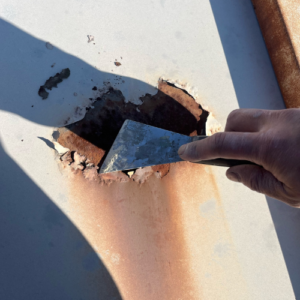 初期錆の徹底的な封じ込め|小さな錆が見られたため、通常の塗装だけでなく、錆を固めて拡散を防ぐ特殊な補修材を使用。見た目を綺麗にするだけでなく、構造へのダメージを防ぐ「防錆」を強化しました。