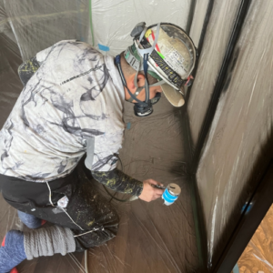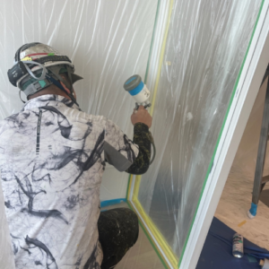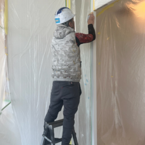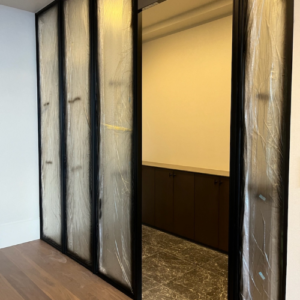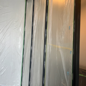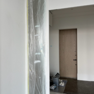 • 内装を汚さない徹底した養生と作業体制: 既に完成している内装を汚さないよう、ガラス面はもちろん、床や壁、家具に至るまで厳重な養生を施しました。さらに、塗料飛散を最小限に抑える手塗り中心の作業と、作業後の清掃を徹底しました。